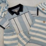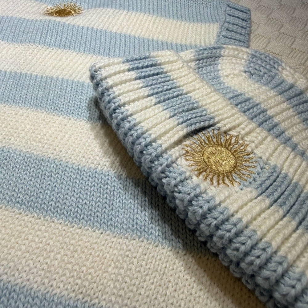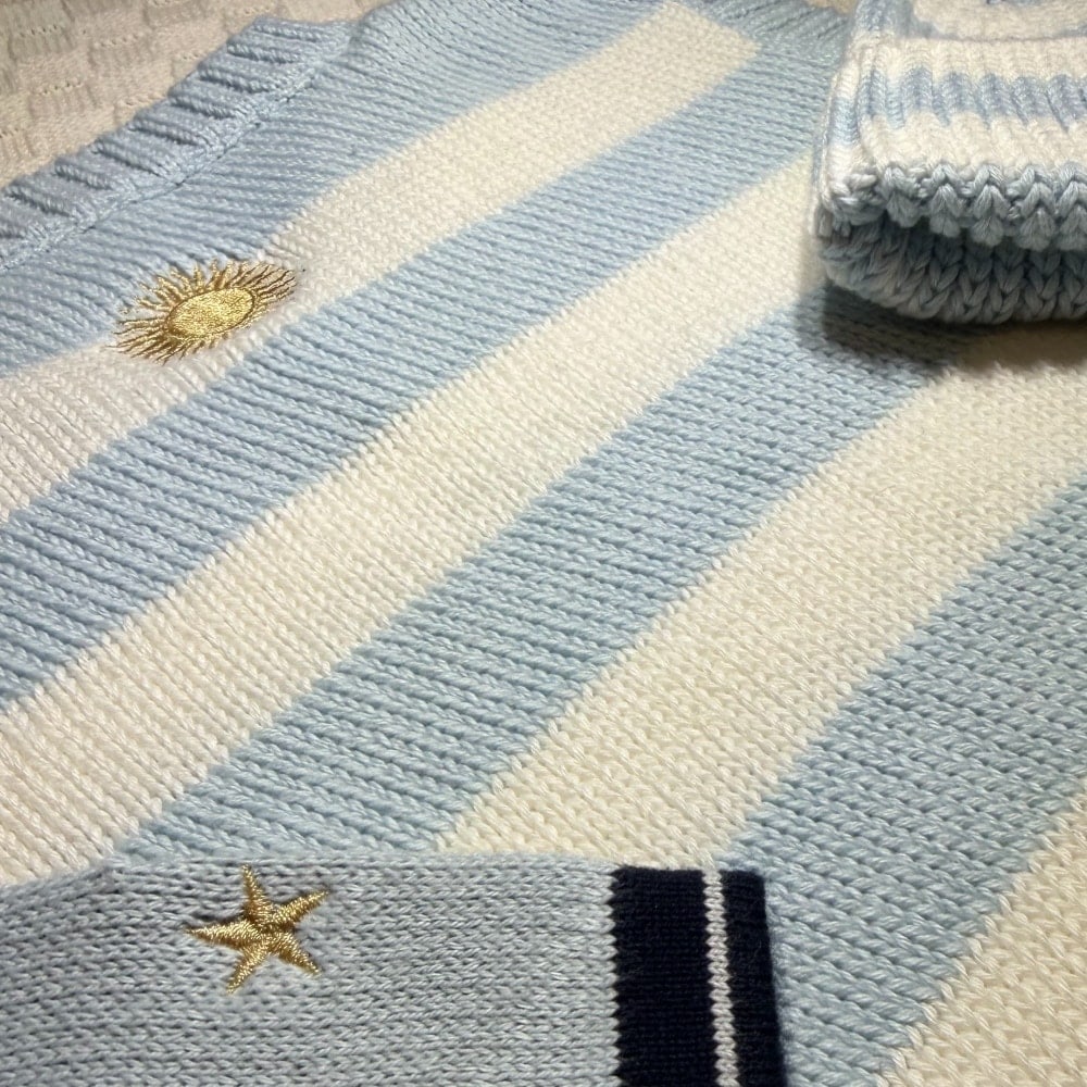 El conjunto Cuna Argentina incluye las cinco piezas: camiseta, pantalón, chaleco, gorro y bufanda. Todo en punto premium, celeste y blanco, con el sol y estrellas bordadas.